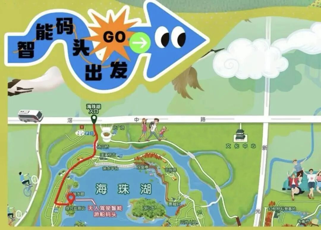 上船地点:海珠湖无人驾驶智能游船码头(竖德生活馆旁),具体地址请参照景区地图及指示牌指引。